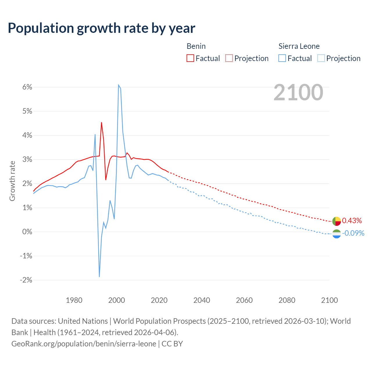 - For the last 10 years, Benin has had an average growth rate of +2.77% per year vs +2.32% in Sierra Leone.