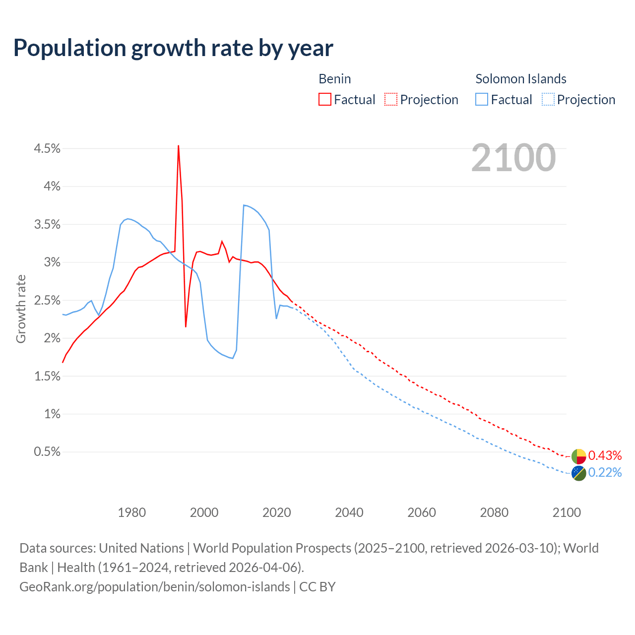 - For the last 10 years, Benin has had an average growth rate of +2.77% per year vs +2.95% in the Solomon Islands.