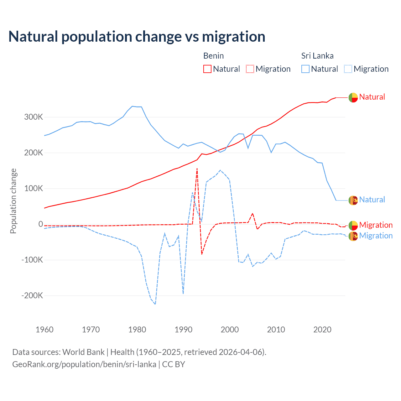 Over the last 10 years, 99.3% of the population change in Benin is from natural causes (a gain of 3,397,218 people) and 0.71% is from migration (a gain of 24,401 people). In Sri Lanka 85.3% is from natural causes (a gain of 1,605,749 people) and 14.7% is from migration (a loss of 276,121 people).
