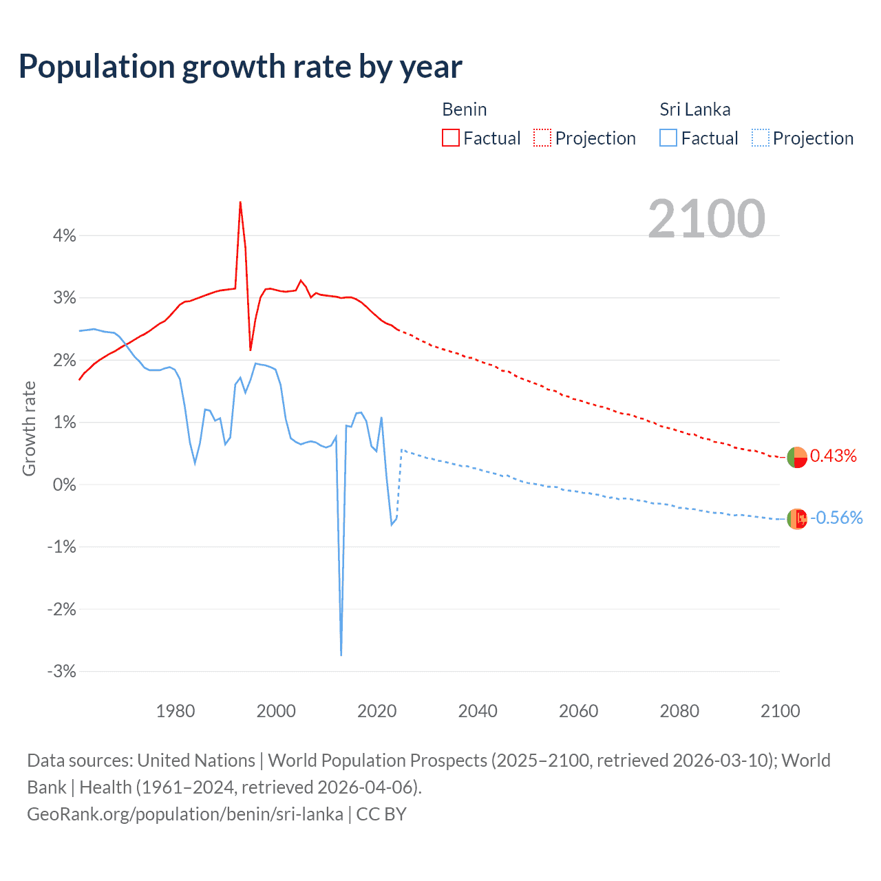 - For the last 10 years, Benin has had an average growth rate of +2.77% per year vs +0.57% in Sri Lanka.