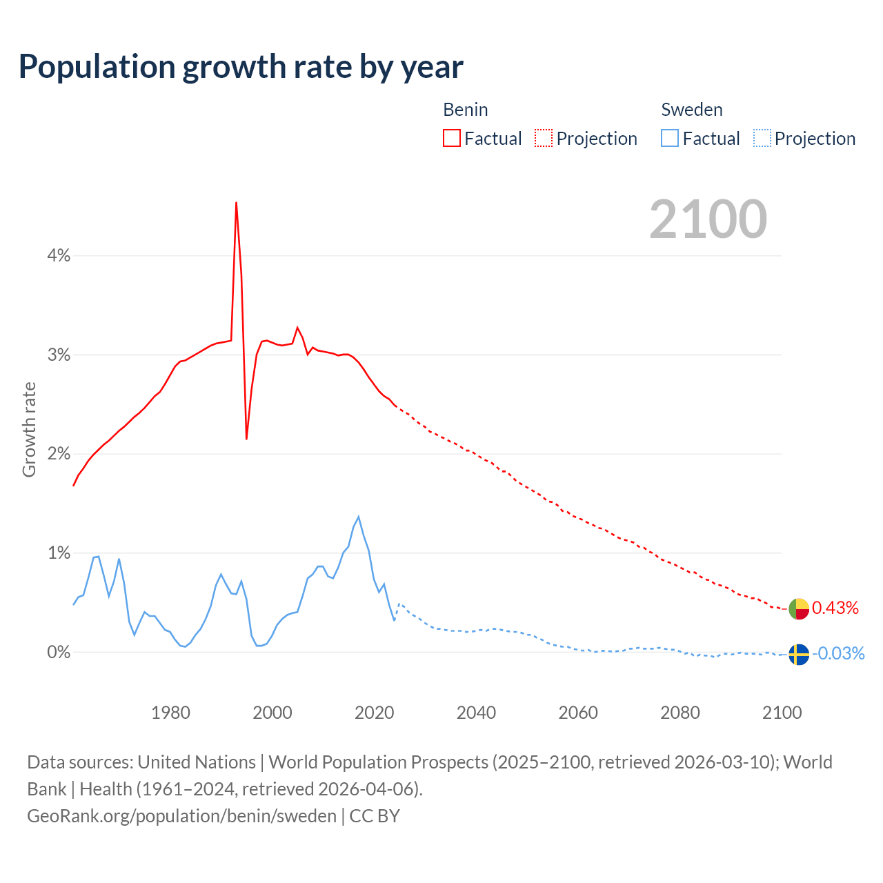 - For the last 10 years, Benin has had an average growth rate of +2.77% per year vs +0.88% in Sweden.