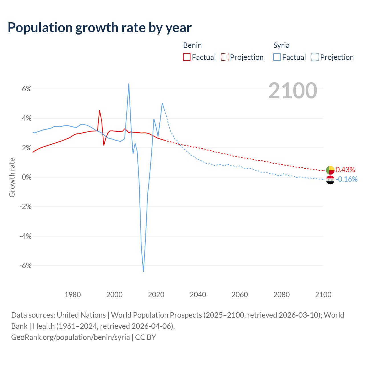 - For the last 10 years, Benin has had an average growth rate of +2.77% per year vs +1.25% in Syria.