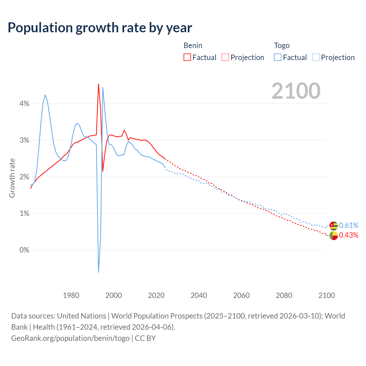 - For the last 10 years, Benin has had an average growth rate of +2.77% per year vs +2.46% in Togo.