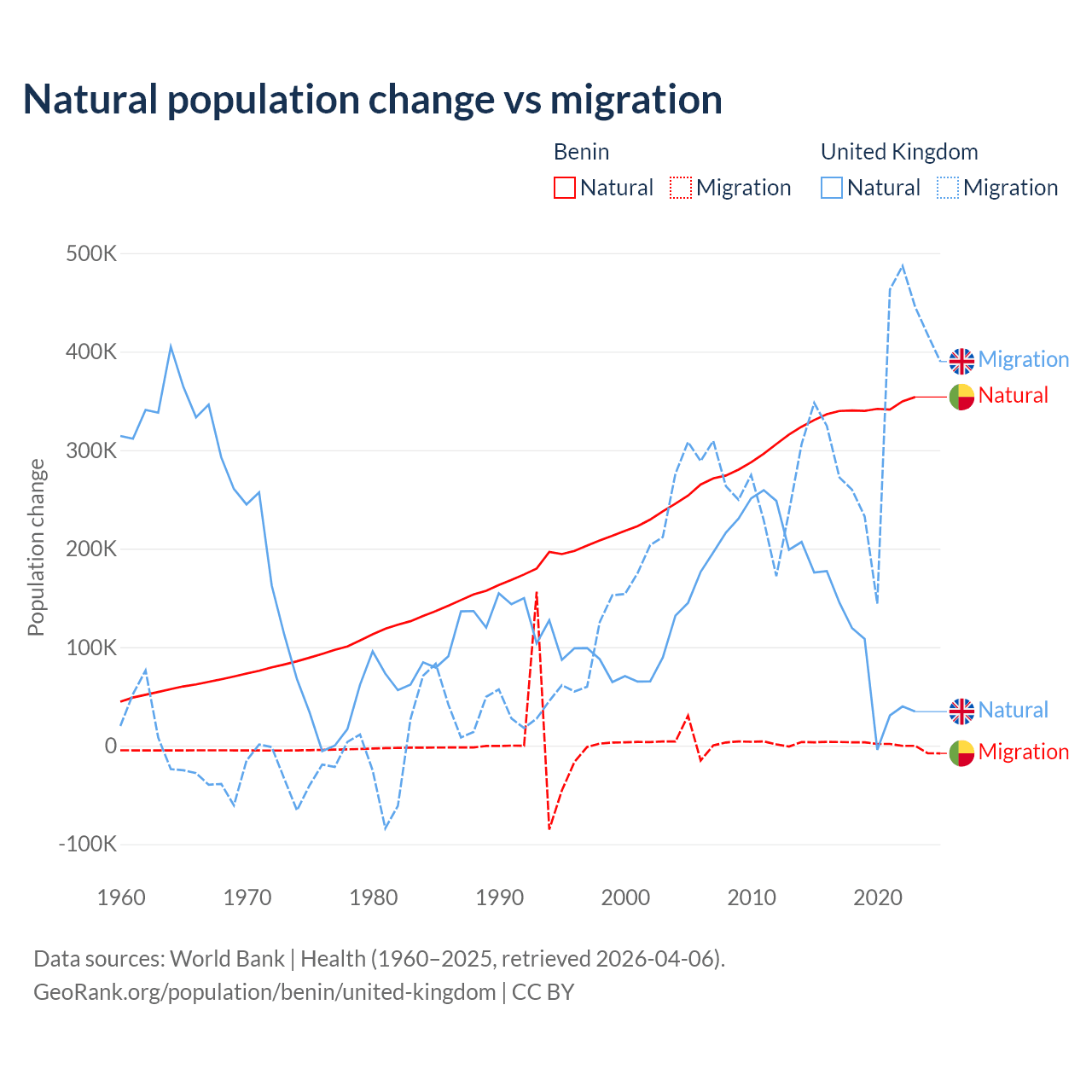 Over the last 10 years, 99.3% of the population change in Benin is from natural causes (a gain of 3,397,218 people) and 0.71% is from migration (a gain of 24,401 people). In the United Kingdom 23.9% is from natural causes (a gain of 1,033,129 people) and 76.1% is from migration (a gain of 3,283,101 people).