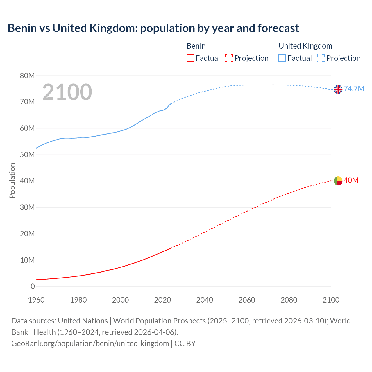 - The United Kingdom's population is 4.59 times bigger than Benin's.