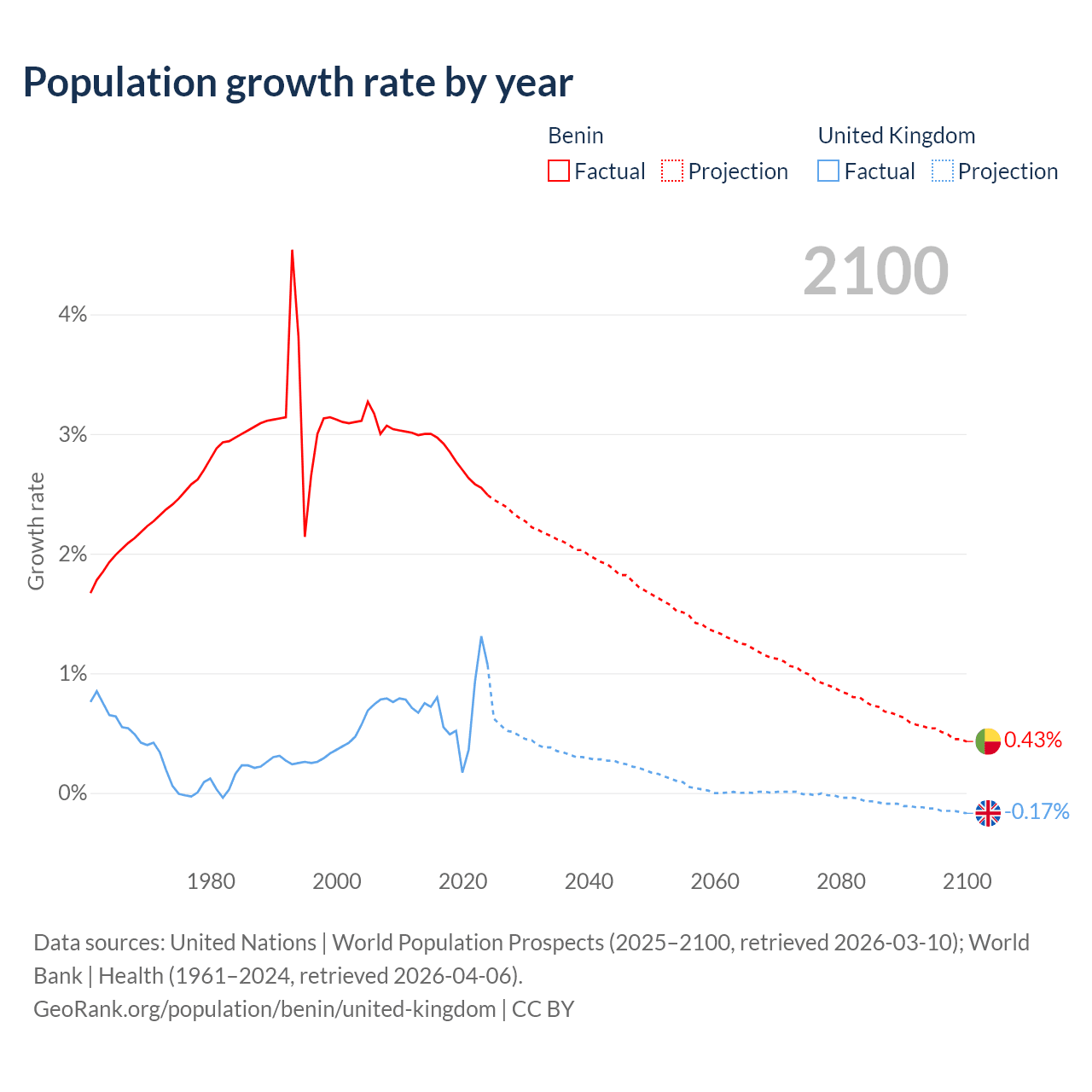 - For the last 10 years, Benin has had an average growth rate of +2.77% per year vs +0.7% in the United Kingdom.