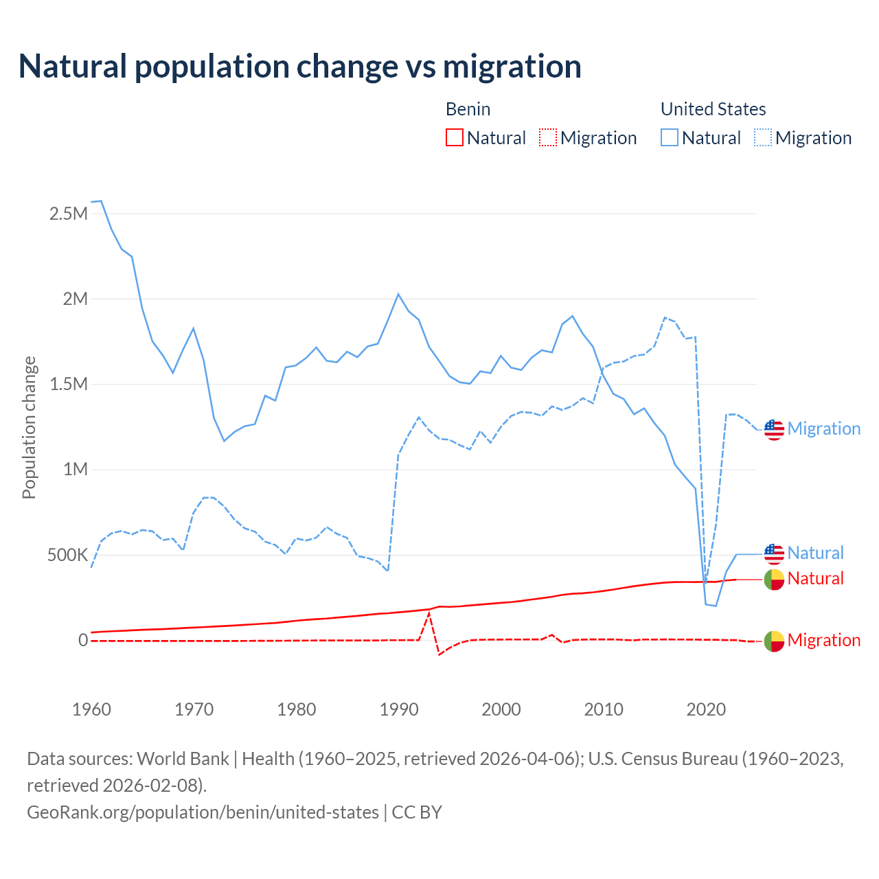 Over the last 10 years, 99.3% of the population change in Benin is from natural causes (a gain of 3,397,218 people) and 0.71% is from migration (a gain of 24,401 people). In the United States 35.8% is from natural causes (a gain of 8,005,866 people) and 64.2% is from migration (a gain of 14,334,286 people).