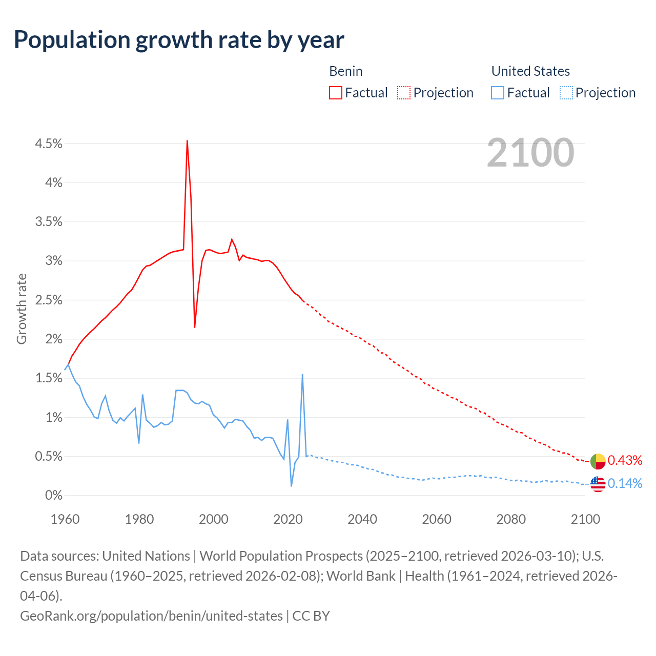 Data sources: World Bank | Health (1960–2024, retrieved 2026-04-06); United Nations | World Population Prospects (1960–2026, retrieved 2026-03-10); U.S. Census Bureau (1960–2025, retrieved 2026-02-08); Central Intelligence Agency (CIA) (2000–2019, retrieved 2026-02-20).