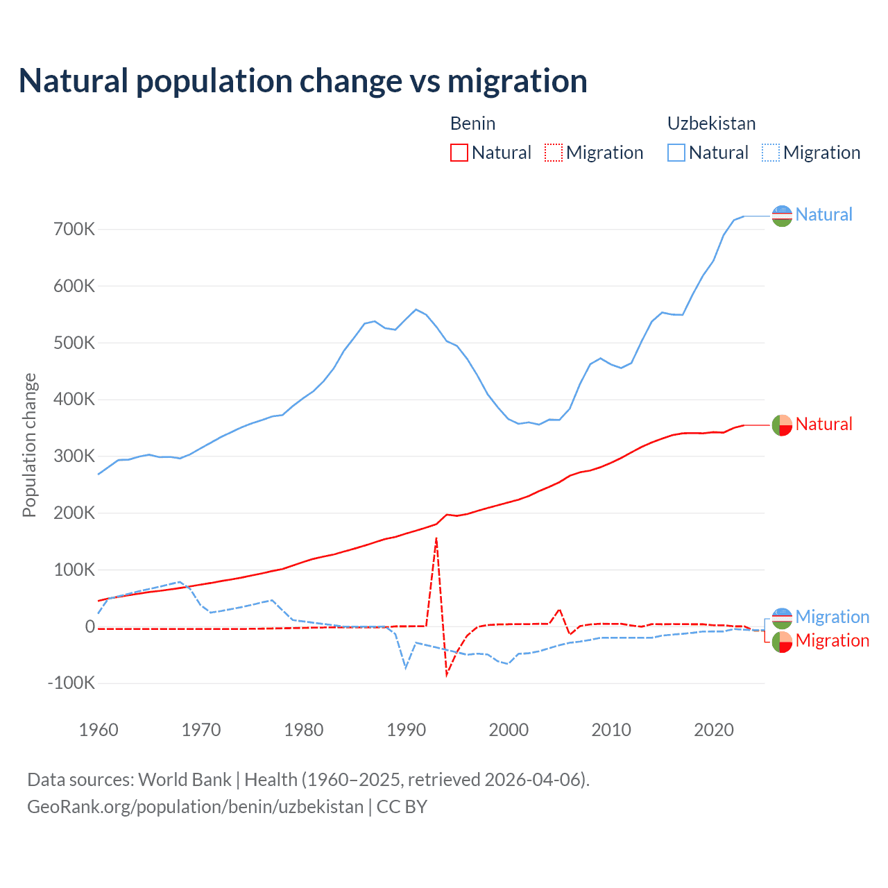 Over the last 10 years, 99.3% of the population change in Benin is from natural causes (a gain of 3,397,218 people) and 0.71% is from migration (a gain of 24,401 people). In Uzbekistan 98.2% is from natural causes (a gain of 6,161,117 people) and 1.84% is from migration (a loss of 115,398 people).