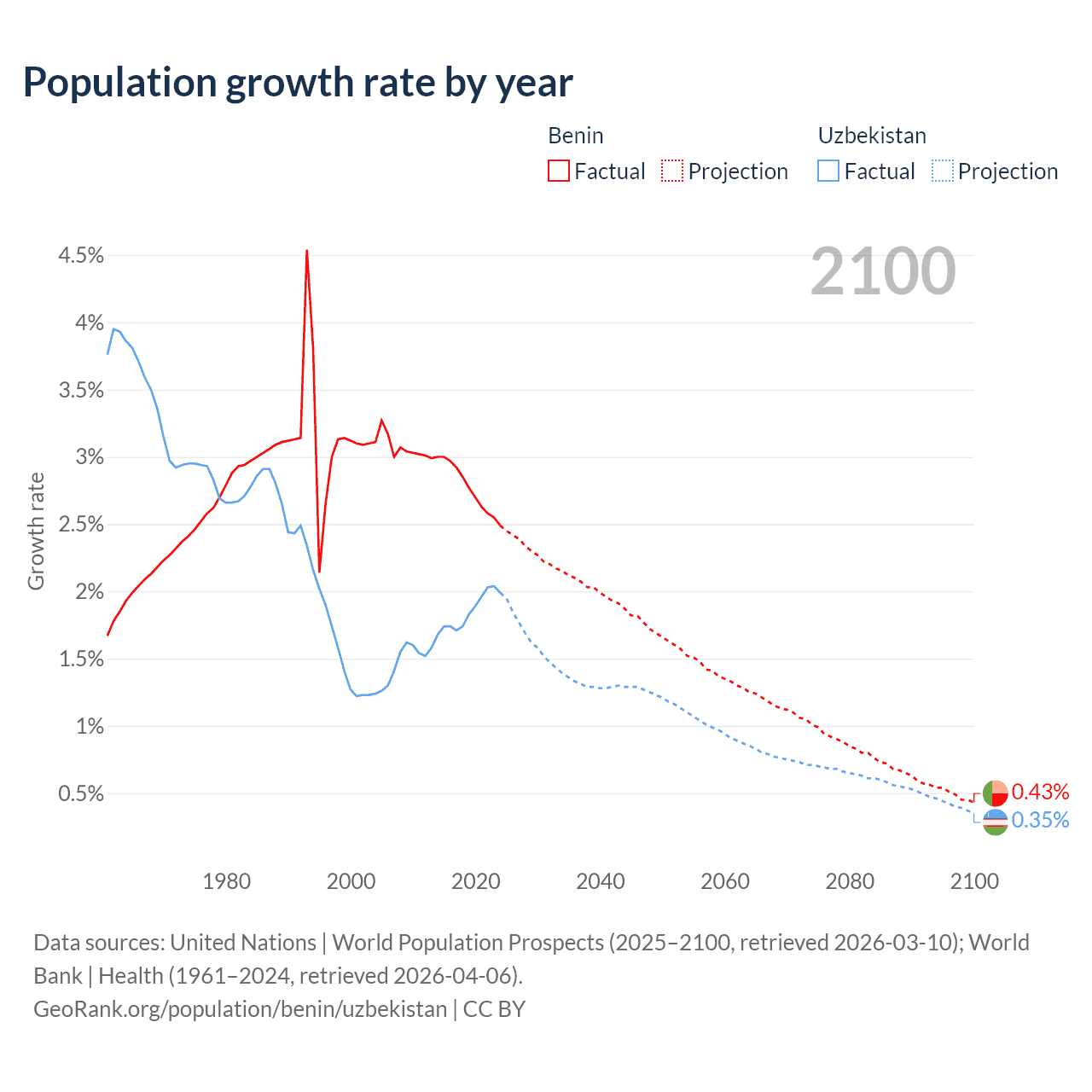 - For the last 10 years, Benin has had an average growth rate of +2.77% per year vs +1.85% in Uzbekistan.