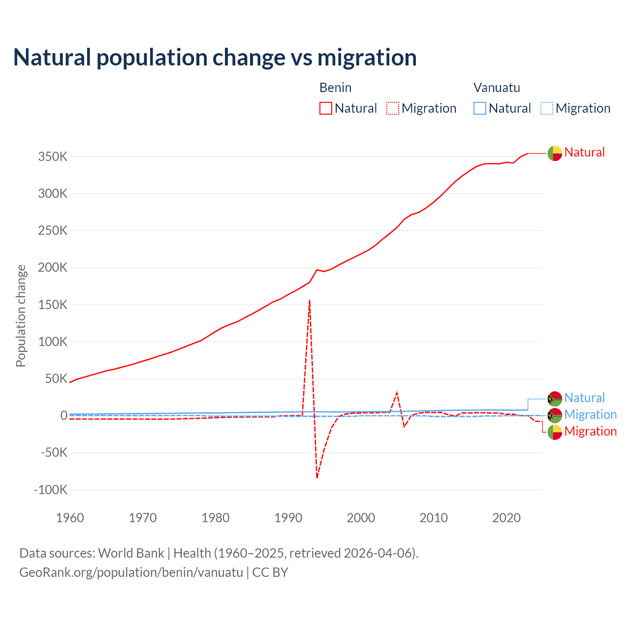 Over the last 10 years, 99.3% of the population change in Benin is from natural causes (a gain of 3,397,218 people) and 0.71% is from migration (a gain of 24,401 people). In Vanuatu 92.2% is from natural causes (a gain of 72,941 people) and 7.81% is from migration (a loss of 6,181 people).