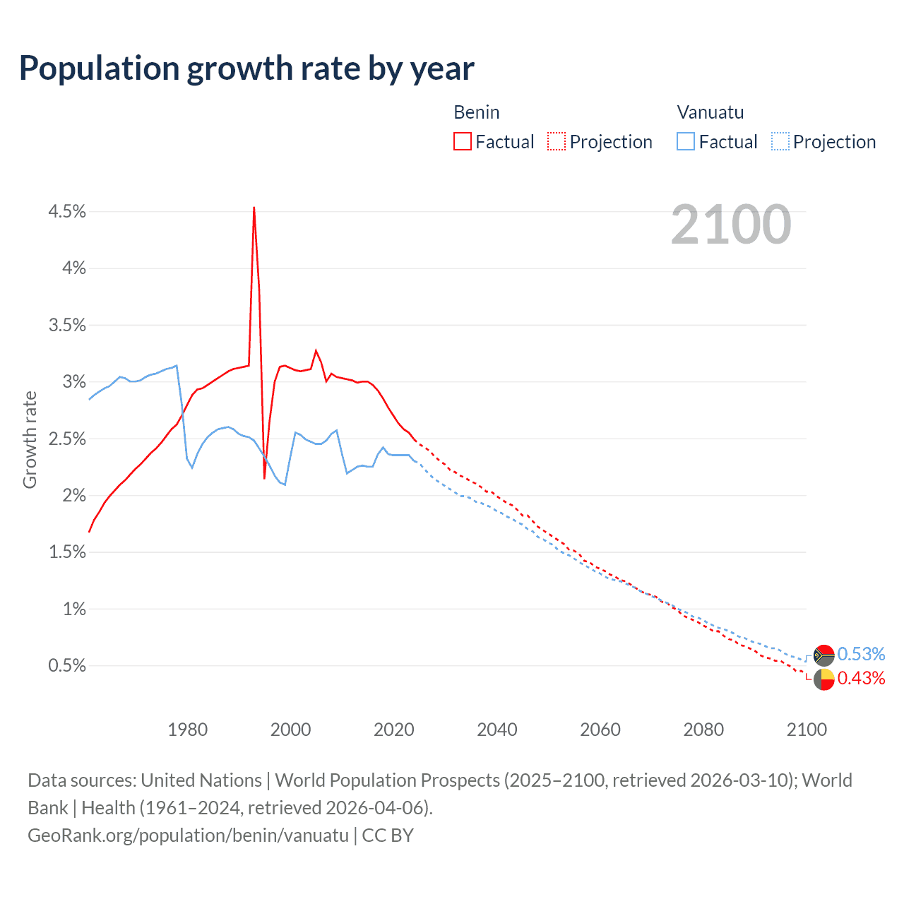 - For the last 10 years, Benin has had an average growth rate of +2.77% per year vs +2.33% in Vanuatu.