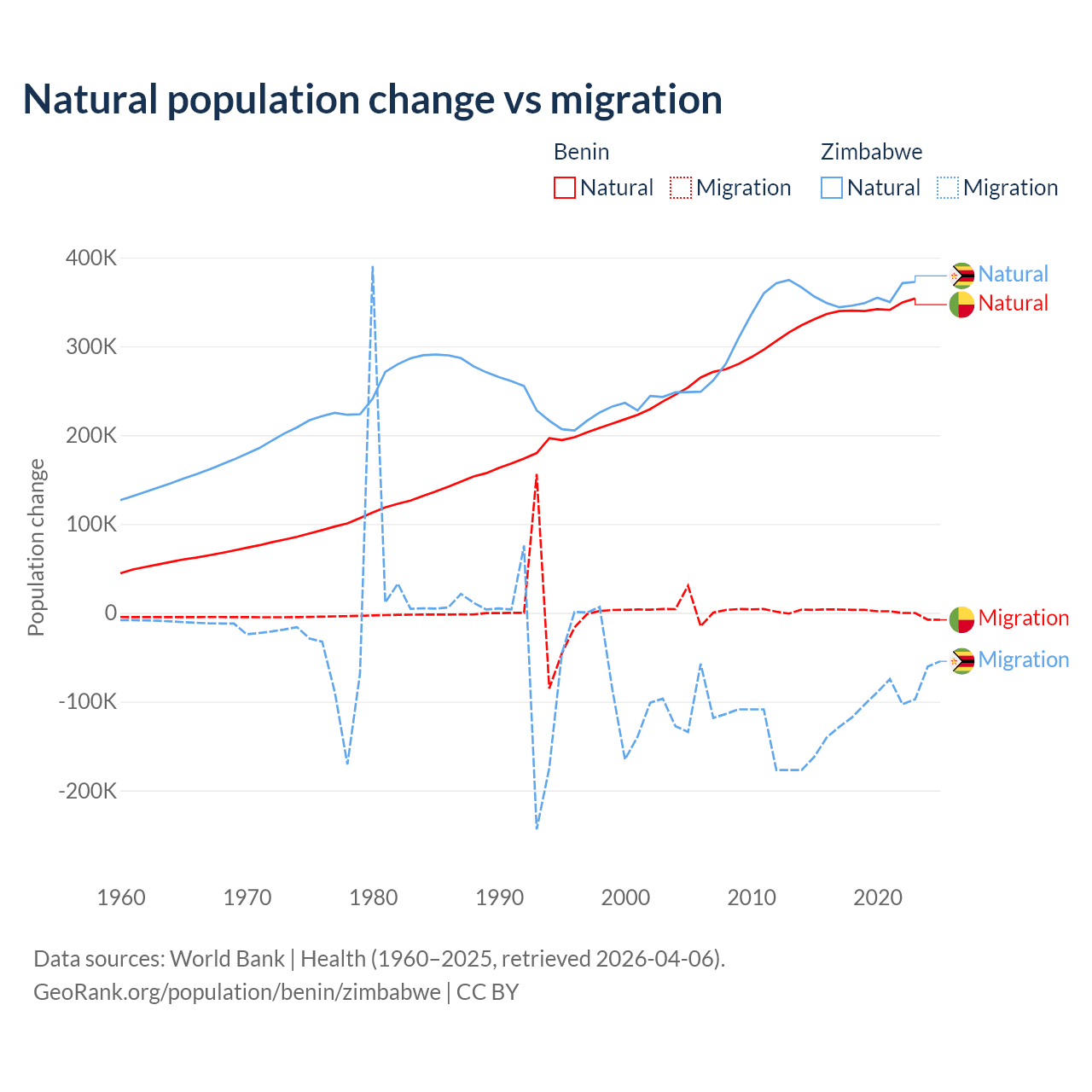 Over the last 10 years, 99.3% of the population change in Benin is from natural causes (a gain of 3,397,218 people) and 0.71% is from migration (a gain of 24,401 people). In Zimbabwe 74.9% is from natural causes (a gain of 3,558,487 people) and 25.1% is from migration (a loss of 1,192,807 people).