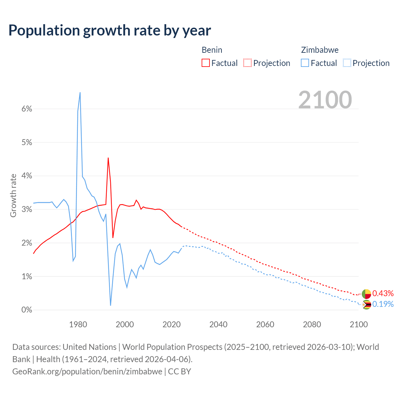 - For the last 10 years, Benin has had an average growth rate of +2.77% per year vs +1.57% in Zimbabwe.