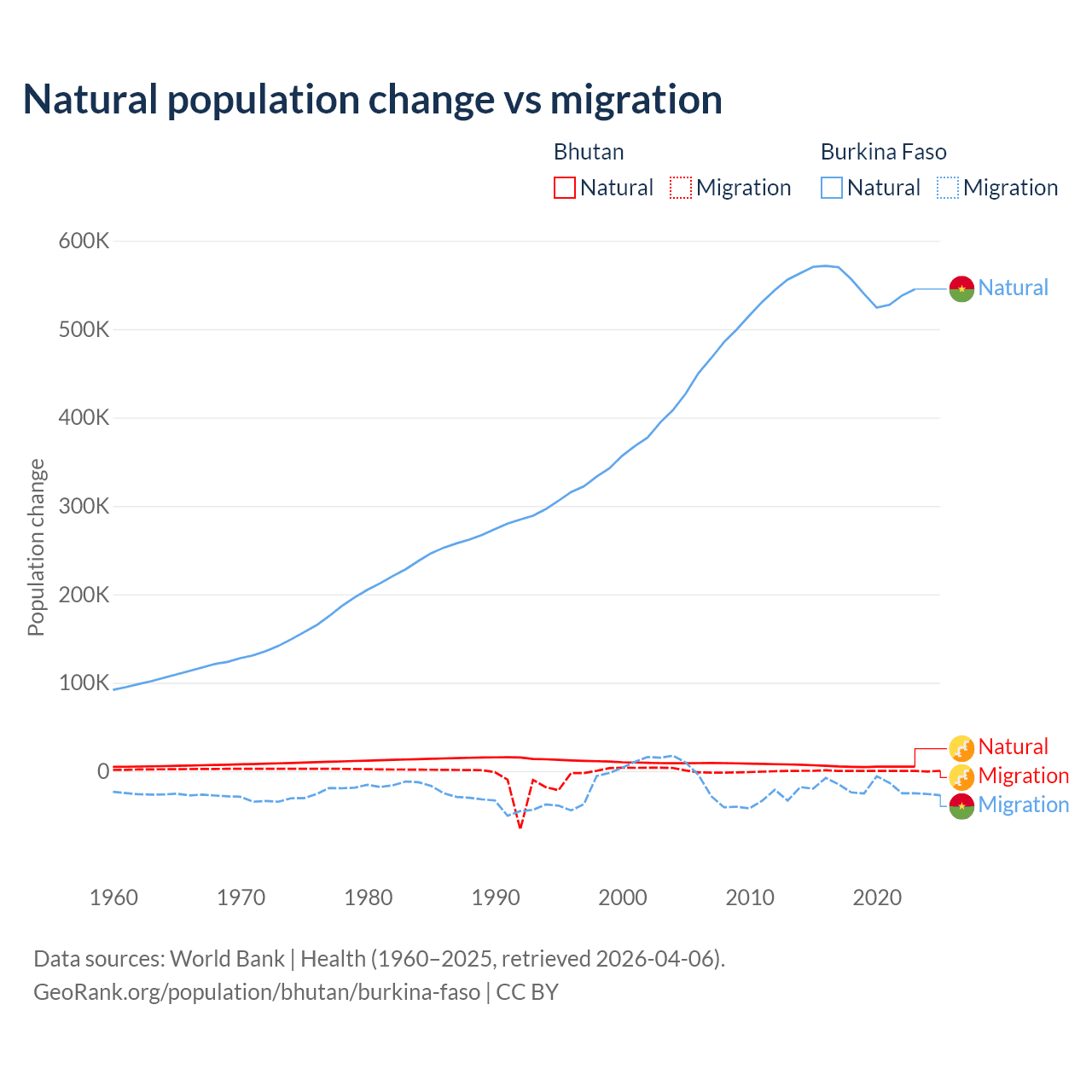 Over the last 10 years, 93.3% of the population change in Bhutan is from natural causes (a gain of 55,796 people) and 6.74% is from migration (a gain of 4,035 people). In Burkina Faso 96.9% is from natural causes (a gain of 5,506,960 people) and 3.13% is from migration (a loss of 177,923 people).