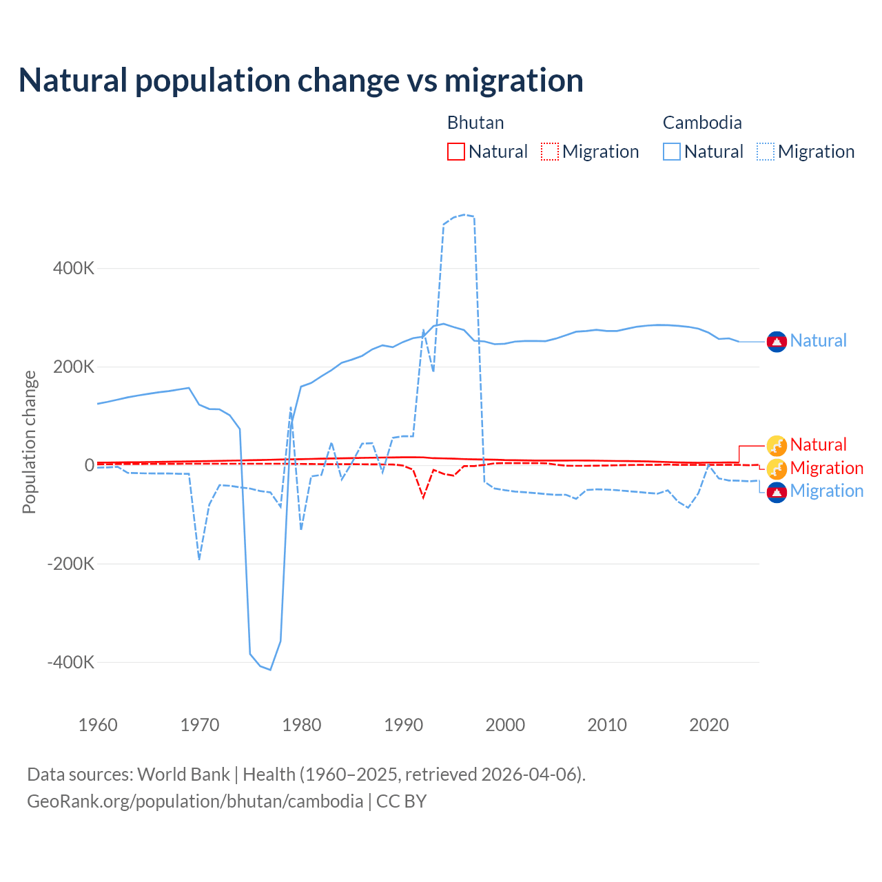Over the last 10 years, 93.3% of the population change in Bhutan is from natural causes (a gain of 55,796 people) and 6.74% is from migration (a gain of 4,035 people). In Cambodia 85.2% is from natural causes (a gain of 2,724,147 people) and 14.8% is from migration (a loss of 474,505 people).