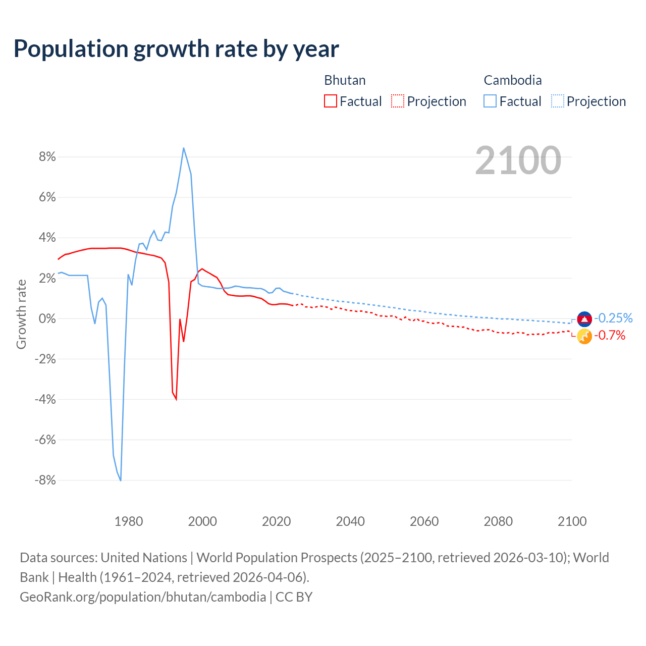 - For the last 10 years, Bhutan has had an average growth rate of +0.8% per year vs +1.38% in Cambodia.