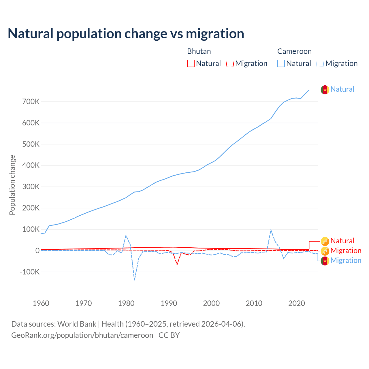 Over the last 10 years, 93.3% of the population change in Bhutan is from natural causes (a gain of 55,796 people) and 6.74% is from migration (a gain of 4,035 people). In Cameroon 99.1% is from natural causes (a gain of 6,982,395 people) and 0.9% is from migration (a gain of 63,139 people).