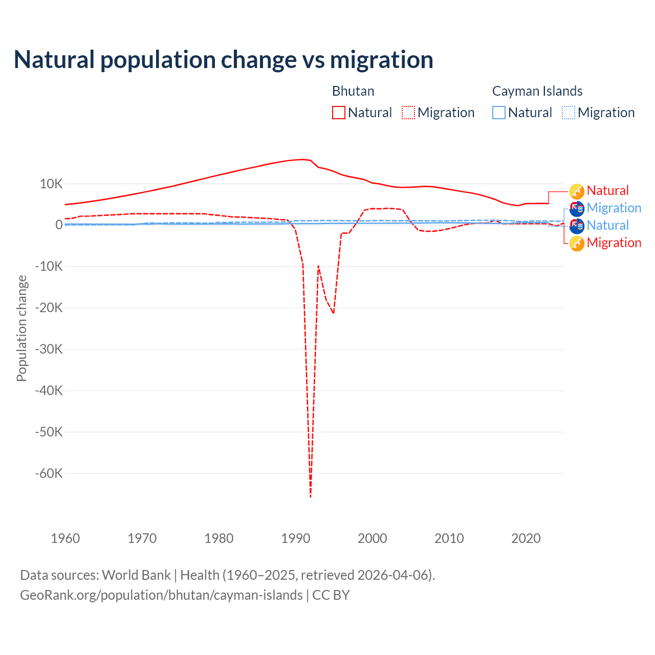 Over the last 10 years, 93.3% of the population change in Bhutan is from natural causes (a gain of 55,796 people) and 6.74% is from migration (a gain of 4,035 people). In the Cayman Islands 31.1% is from natural causes (a gain of 4,468 people) and 68.9% is from migration (a gain of 9,879 people).