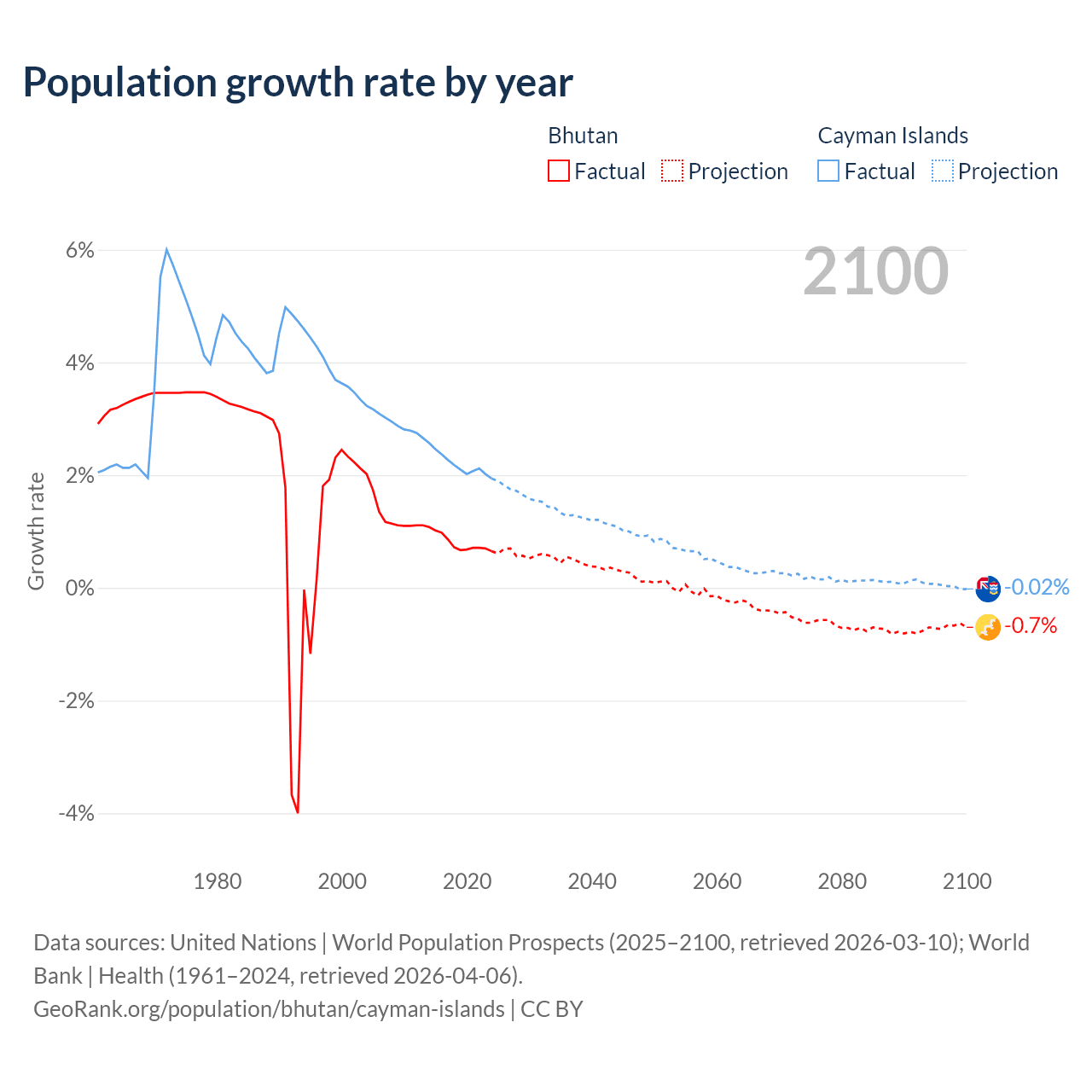 - For the last 10 years, Bhutan has had an average growth rate of +0.8% per year vs +2.19% in the Cayman Islands.