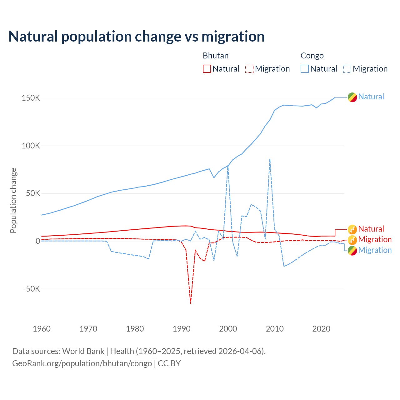 Over the last 10 years, 93.3% of the population change in Bhutan is from natural causes (a gain of 55,796 people) and 6.74% is from migration (a gain of 4,035 people). In the Congo 94% is from natural causes (a gain of 1,434,056 people) and 6.04% is from migration (a loss of 92,251 people).