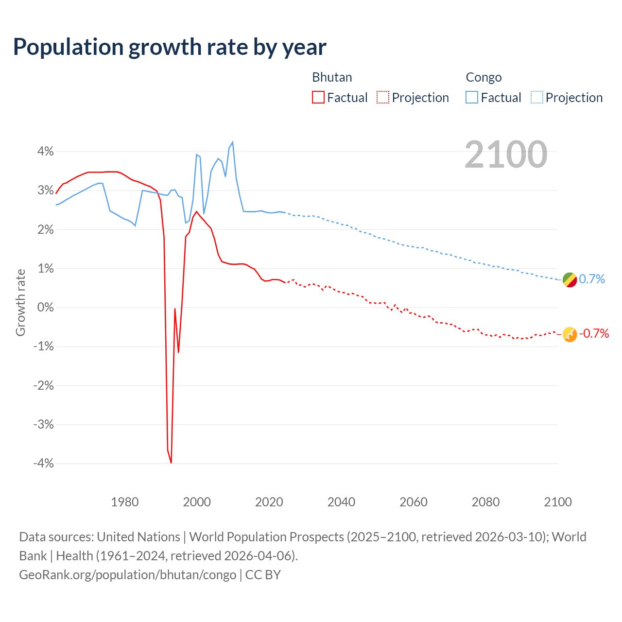 - For the last 10 years, Bhutan has had an average growth rate of +0.8% per year vs +2.44% in the Congo.