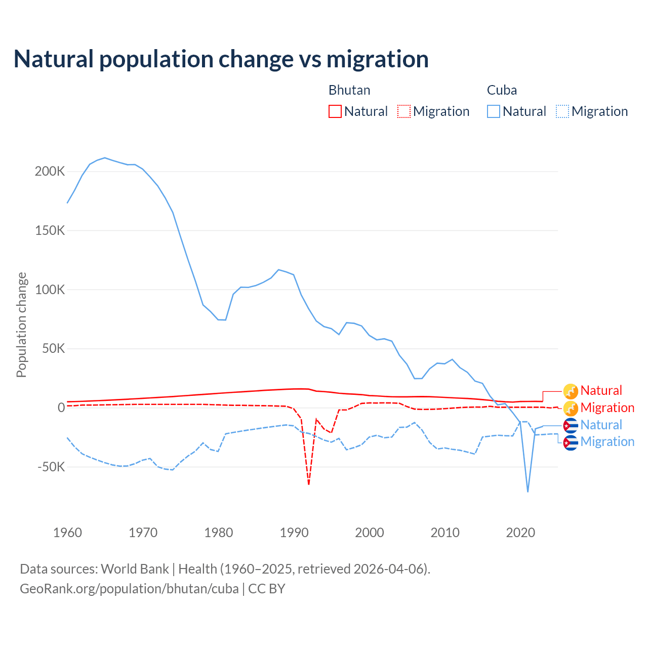Over the last 10 years, 93.3% of the population change in Bhutan is from natural causes (a gain of 55,796 people) and 6.74% is from migration (a gain of 4,035 people). In Cuba 21.9% is from natural causes (a loss of 64,179 people) and 78.1% is from migration (a loss of 229,508 people).