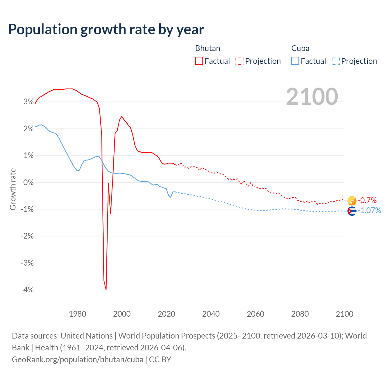- For the last 10 years, Bhutan has had an average growth rate of +0.8% per year vs -0.26% in Cuba.