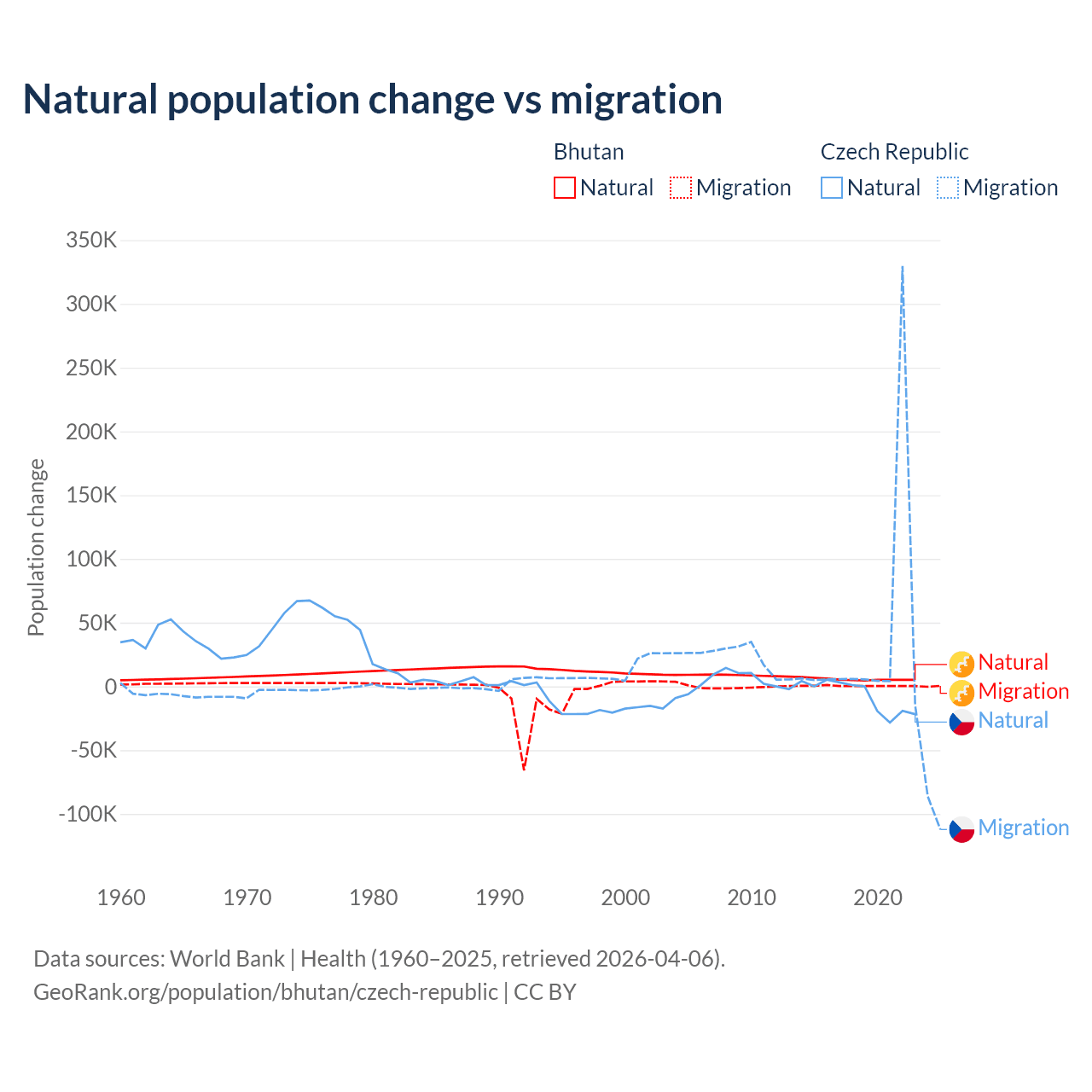 Over the last 10 years, 93.3% of the population change in Bhutan is from natural causes (a gain of 55,796 people) and 6.74% is from migration (a gain of 4,035 people). In the Czech Republic 17.3% is from natural causes (a loss of 74,826 people) and 82.7% is from migration (a gain of 357,502 people).