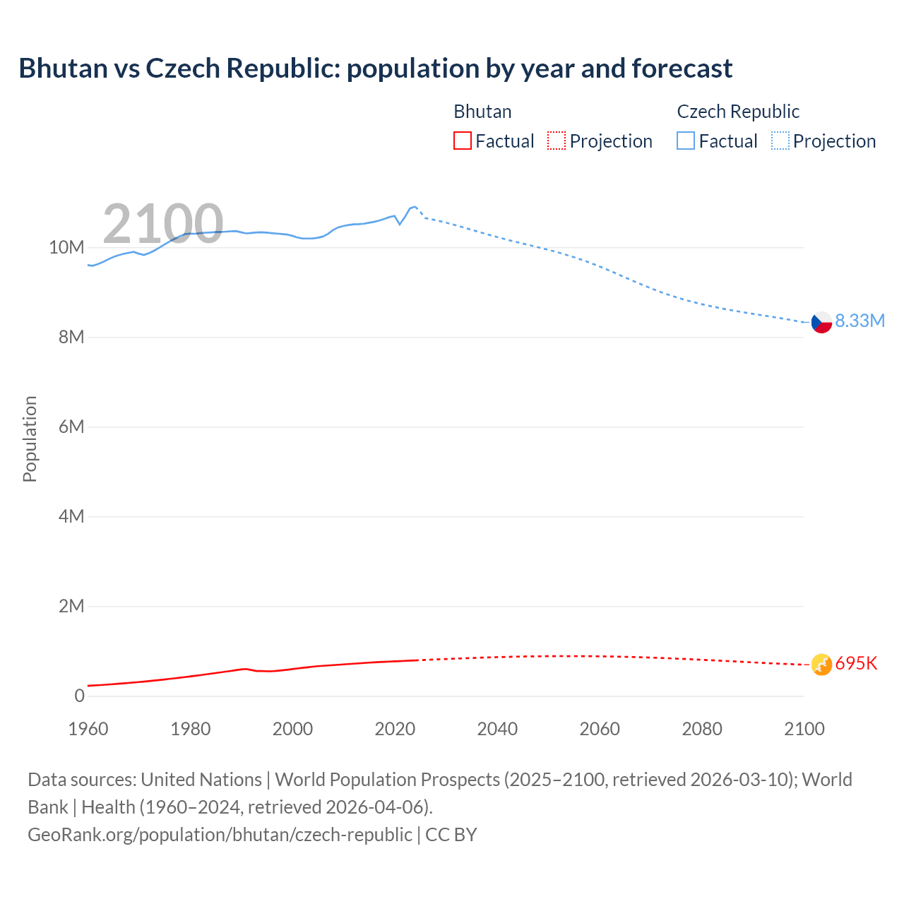 The latest officially reported population of Bhutan was 791,524 in 2024 vs 10,905,028 people in the Czech Republic in 2024. In 2026, based on the adjusted UN estimation, the current Bhutan's population is 803,385 people compared to 10,649,126 in the Czech Republic.