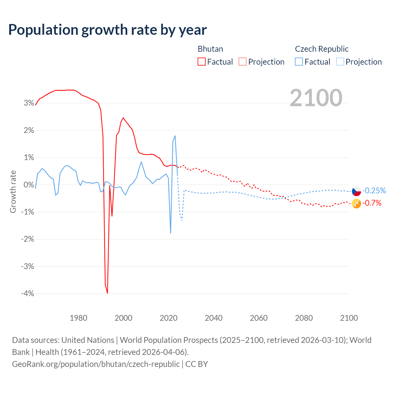 - For the last 10 years, Bhutan has had an average growth rate of +0.8% per year vs +0.34% in the Czech Republic.