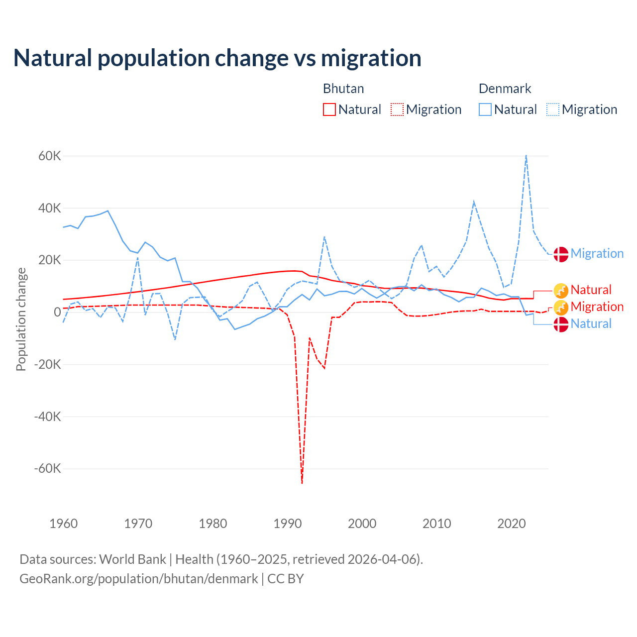 Over the last 10 years, 93.3% of the population change in Bhutan is from natural causes (a gain of 55,796 people) and 6.74% is from migration (a gain of 4,035 people). In Denmark 15.4% is from natural causes (a gain of 51,826 people) and 84.6% is from migration (a gain of 284,848 people).