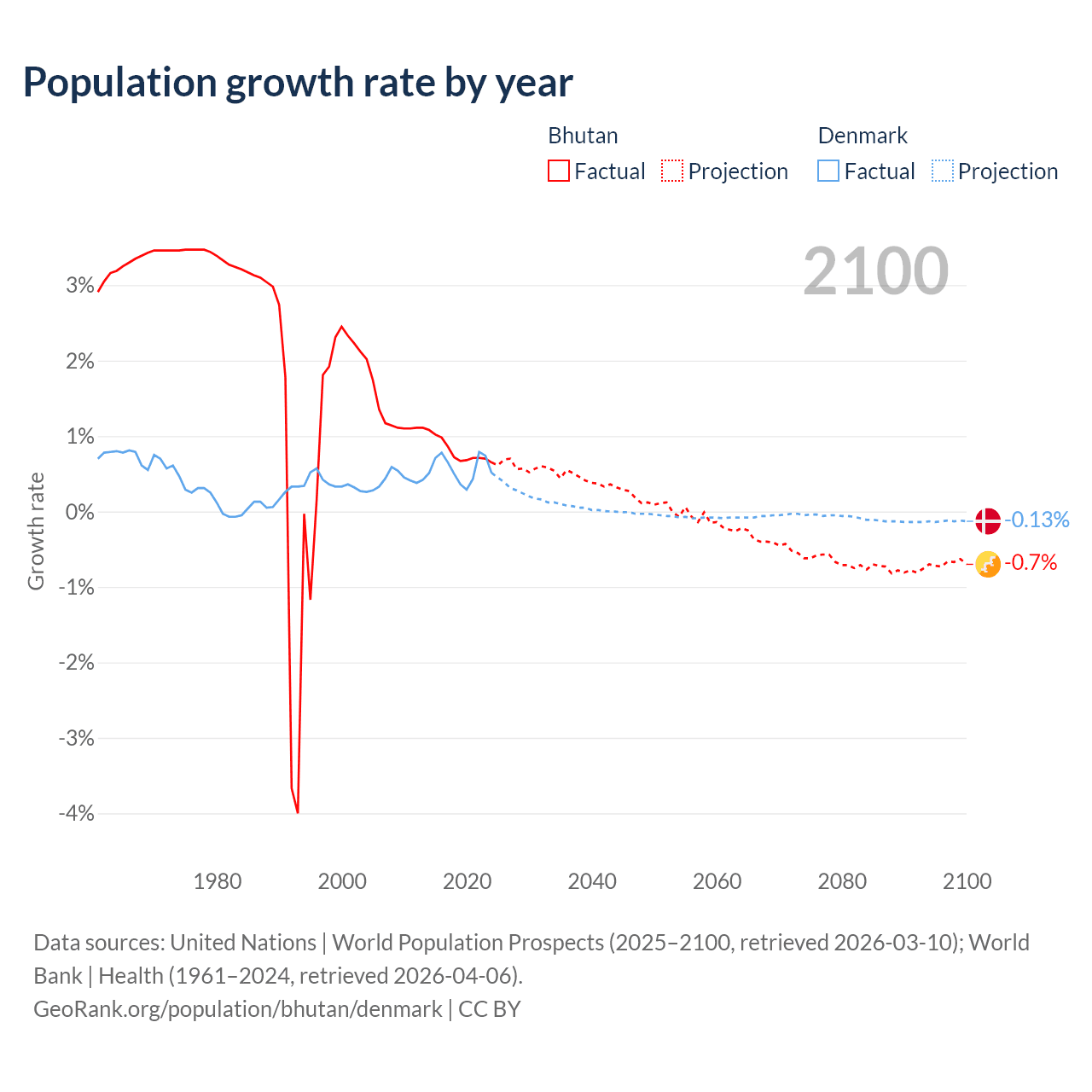 - For the last 10 years, Bhutan has had an average growth rate of +0.8% per year vs +0.57% in Denmark.