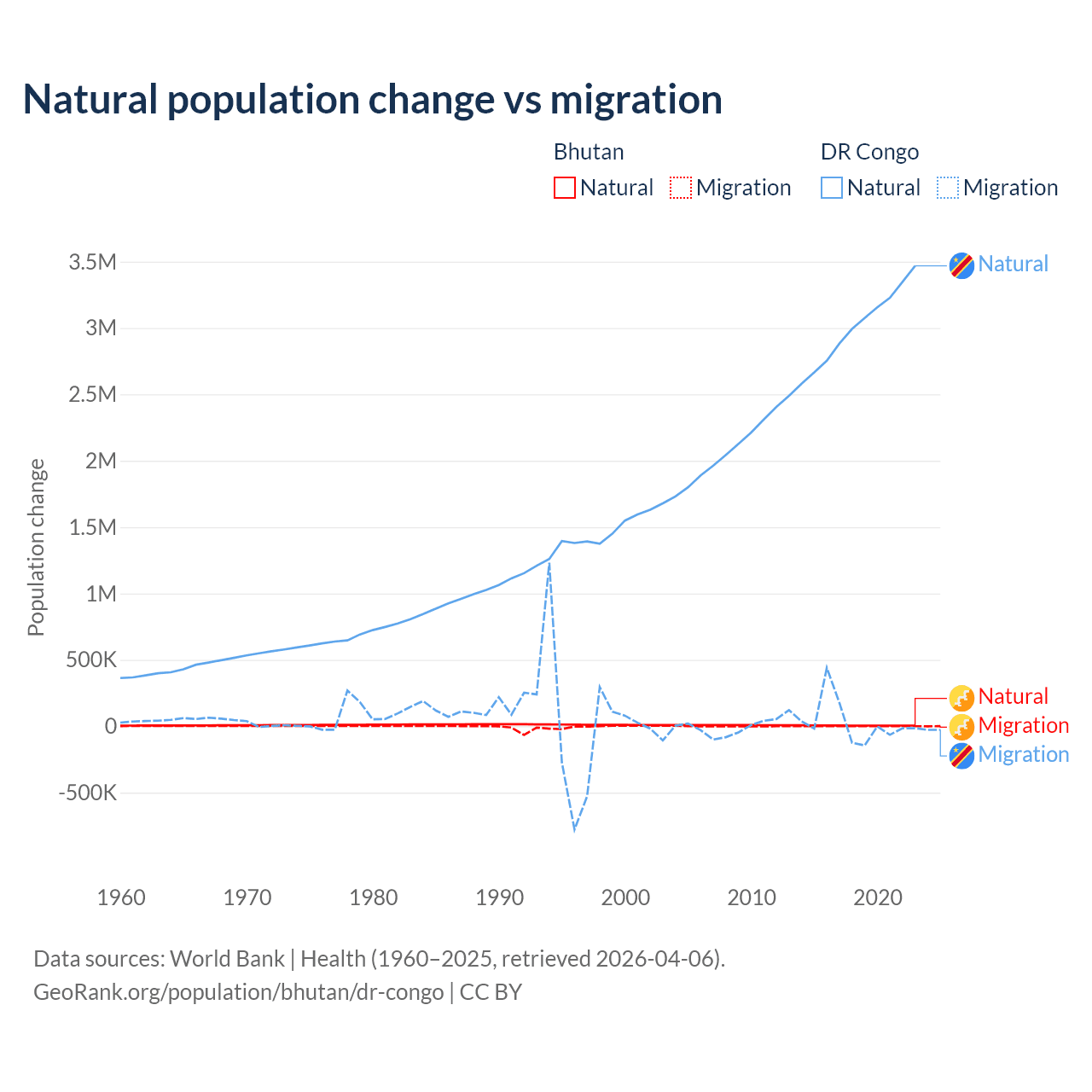 Over the last 10 years, 93.3% of the population change in Bhutan is from natural causes (a gain of 55,796 people) and 6.74% is from migration (a gain of 4,035 people). In the DR Congo 99.1% is from natural causes (a gain of 30,150,516 people) and 0.89% is from migration (a gain of 270,872 people).