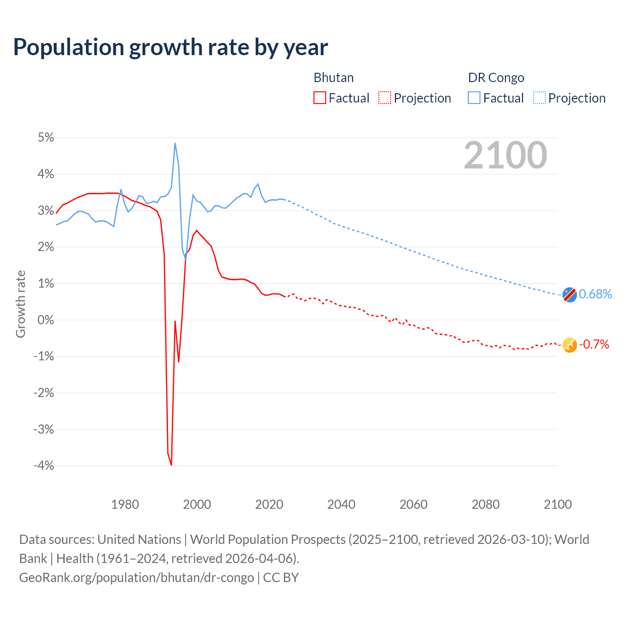 - For the last 10 years, Bhutan has had an average growth rate of +0.8% per year vs +3.38% in the DR Congo.