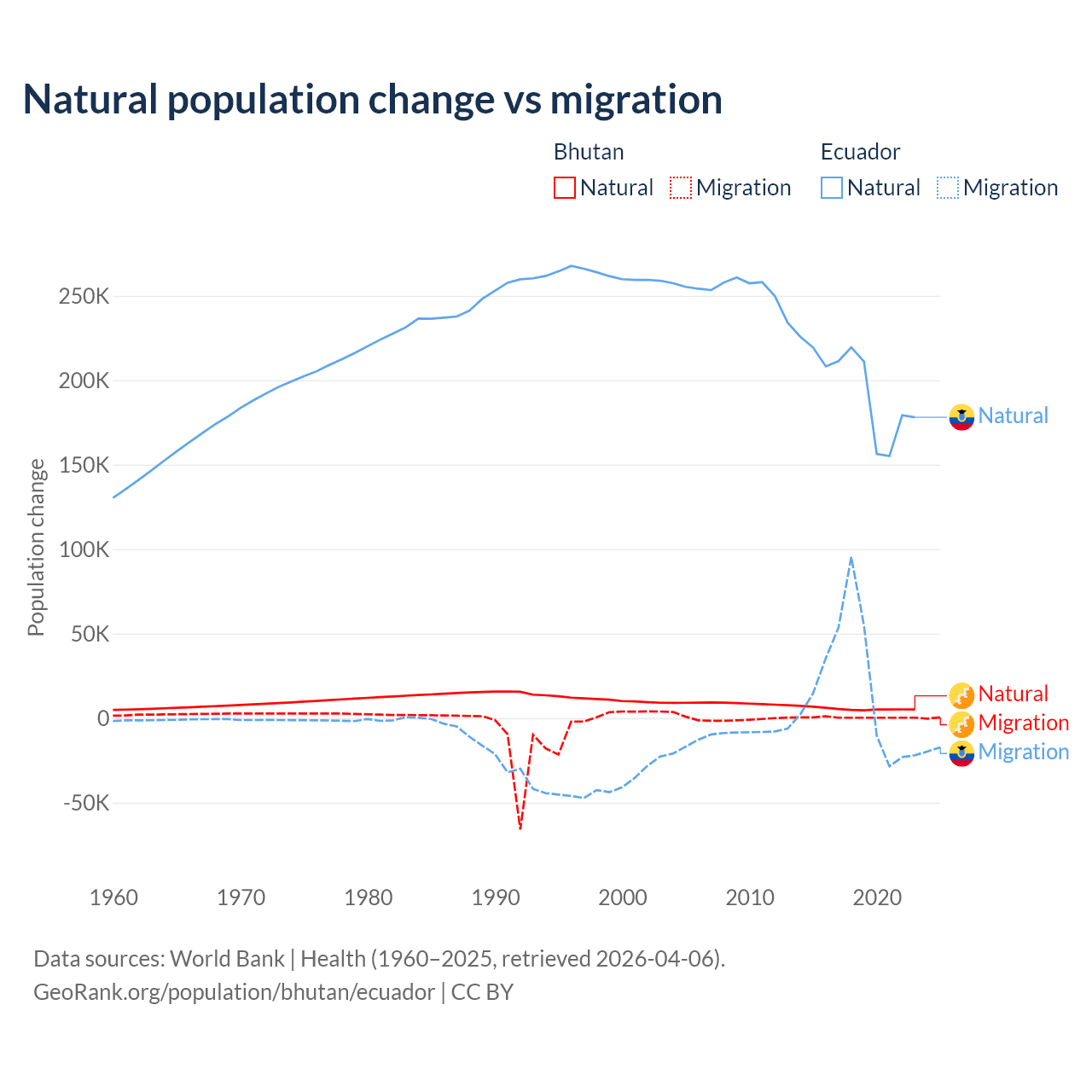 Over the last 10 years, 93.3% of the population change in Bhutan is from natural causes (a gain of 55,796 people) and 6.74% is from migration (a gain of 4,035 people). In Ecuador 91.9% is from natural causes (a gain of 1,964,352 people) and 8.08% is from migration (a gain of 172,707 people).