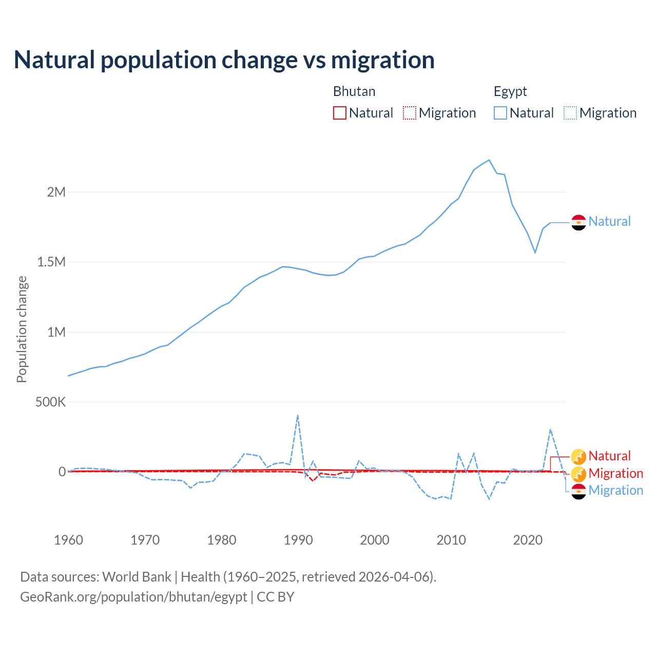 Over the last 10 years, 93.3% of the population change in Bhutan is from natural causes (a gain of 55,796 people) and 6.74% is from migration (a gain of 4,035 people). In Egypt 99.6% is from natural causes (a gain of 19,180,073 people) and 0.41% is from migration (a loss of 78,975 people).