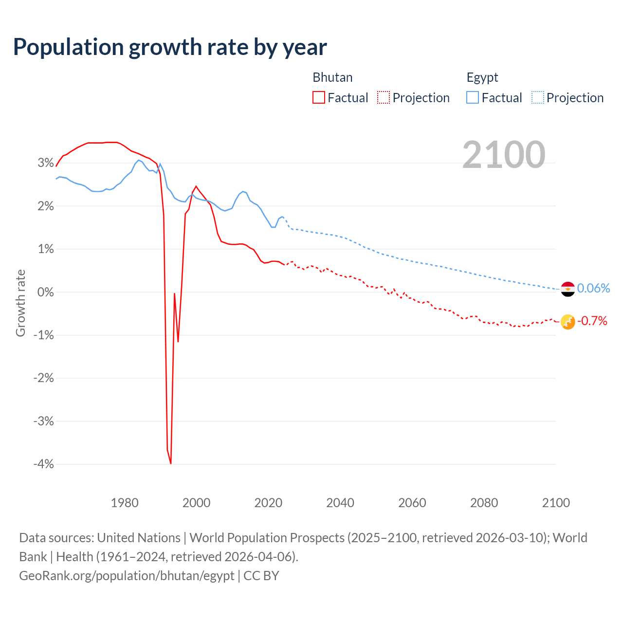 - For the last 10 years, Bhutan has had an average growth rate of +0.8% per year vs +1.84% in Egypt.
