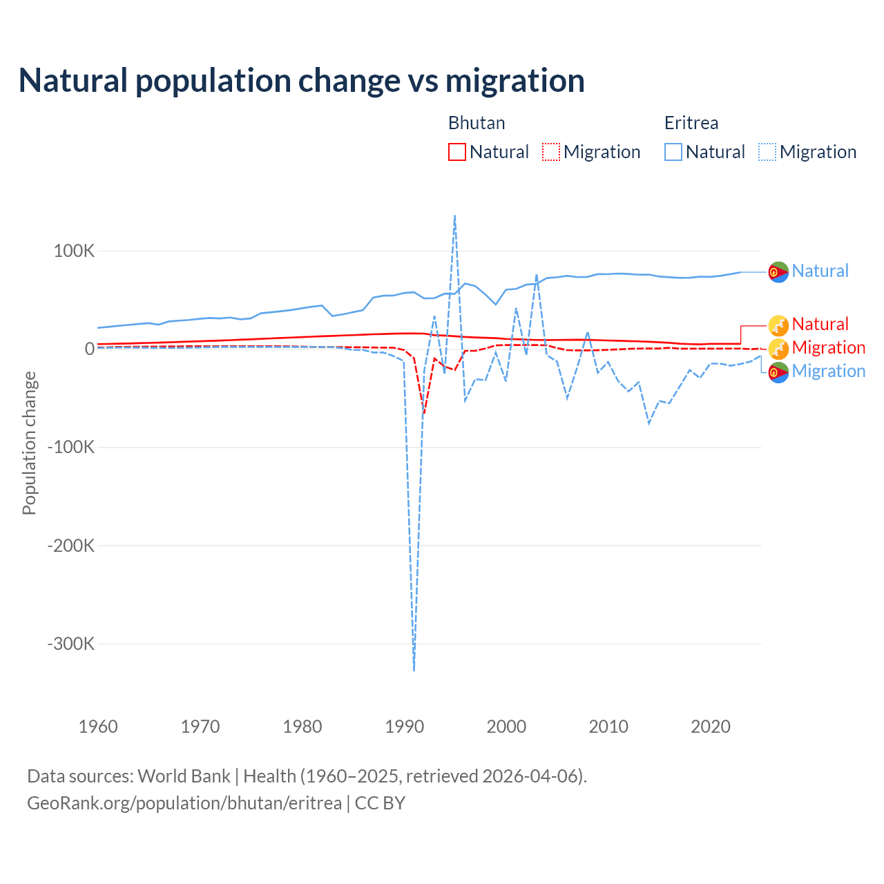Over the last 10 years, 93.3% of the population change in Bhutan is from natural causes (a gain of 55,796 people) and 6.74% is from migration (a gain of 4,035 people). In Eritrea 68.8% is from natural causes (a gain of 742,837 people) and 31.2% is from migration (a loss of 336,243 people).