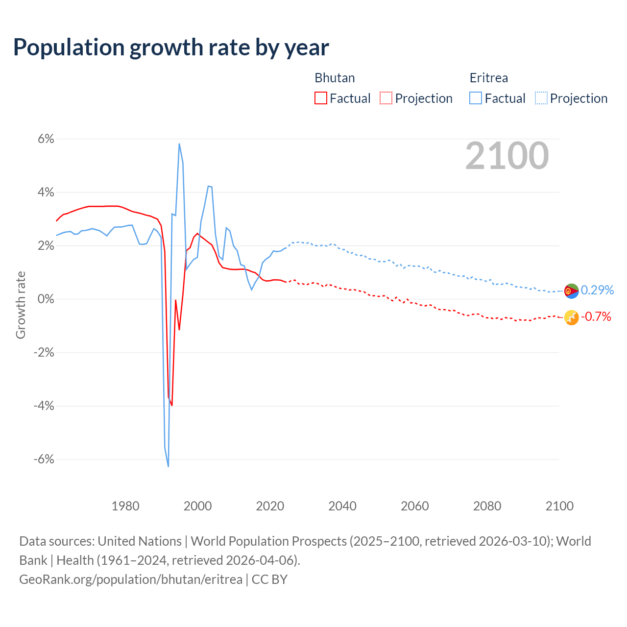 - For the last 10 years, Bhutan has had an average growth rate of +0.8% per year vs +1.28% in Eritrea.