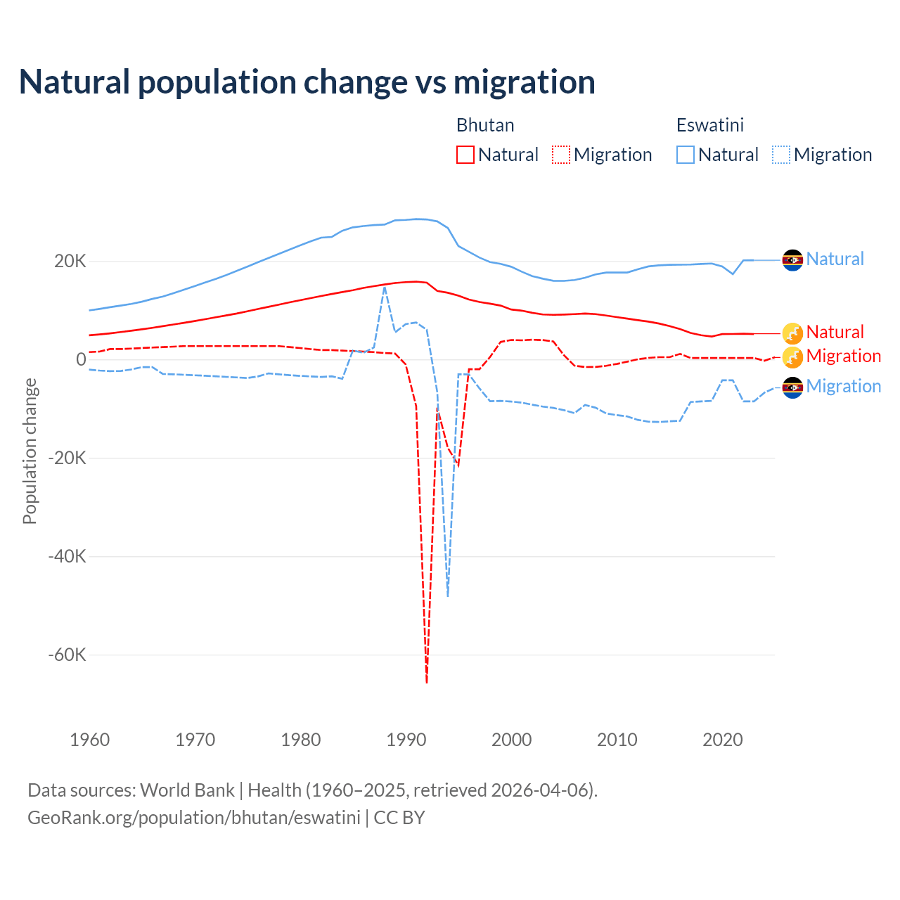 Over the last 10 years, 93.3% of the population change in Bhutan is from natural causes (a gain of 55,796 people) and 6.74% is from migration (a gain of 4,035 people). In Eswatini 68.3% is from natural causes (a gain of 192,206 people) and 31.7% is from migration (a loss of 89,012 people).