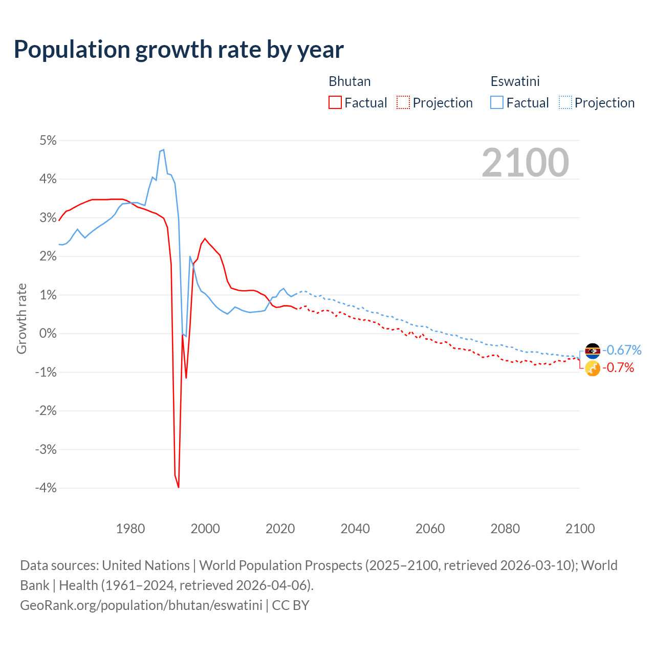 - For the last 10 years, Bhutan has had an average growth rate of +0.8% per year vs +0.87% in Eswatini.