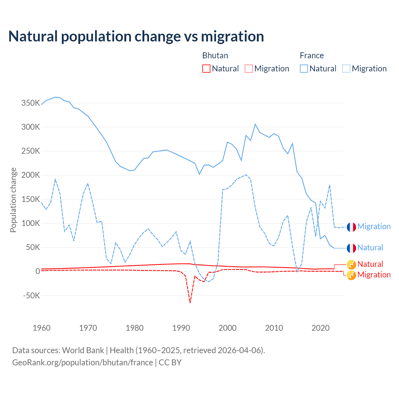 Over the last 10 years, 93.3% of the population change in Bhutan is from natural causes (a gain of 55,796 people) and 6.74% is from migration (a gain of 4,035 people). In France 59.5% is from natural causes (a gain of 1,359,540 people) and 40.5% is from migration (a gain of 923,723 people).