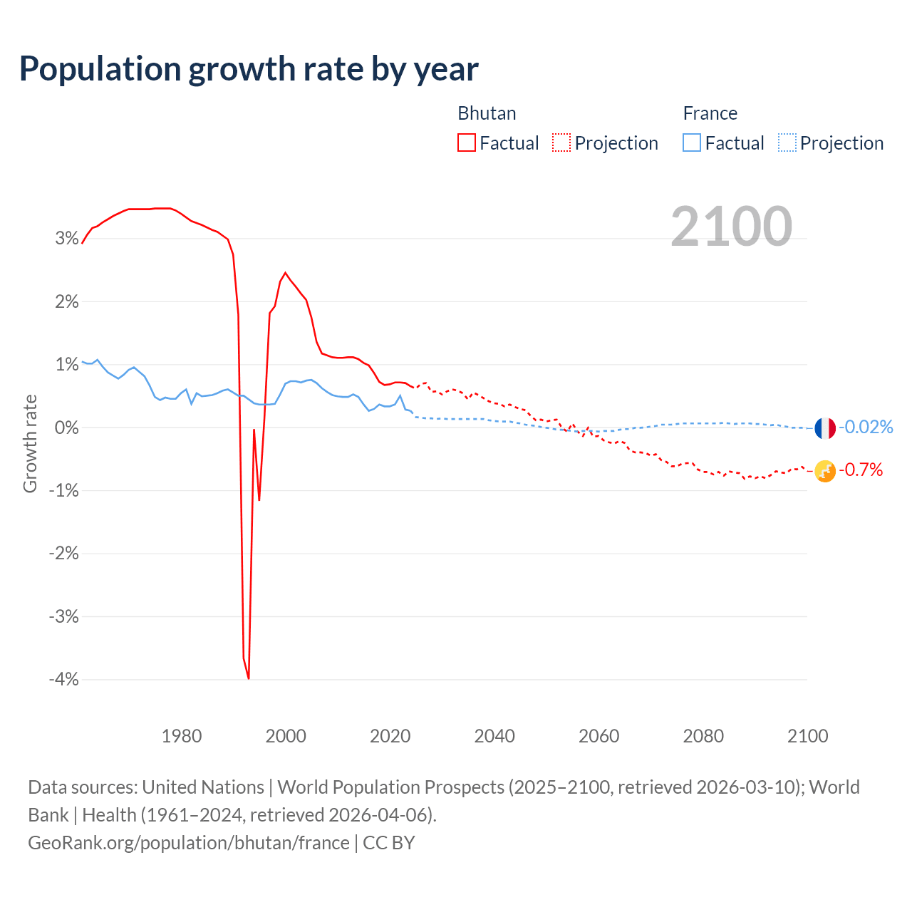 - For the last 10 years, Bhutan has had an average growth rate of +0.8% per year vs +0.35% in France.
