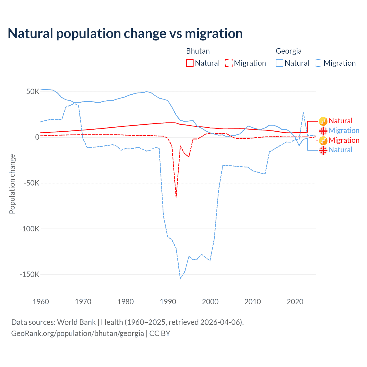 Over the last 10 years, 93.3% of the population change in Bhutan is from natural causes (a gain of 55,796 people) and 6.74% is from migration (a gain of 4,035 people). In Georgia 57.7% is from natural causes (a gain of 47,646 people) and 42.3% is from migration (a loss of 34,907 people).