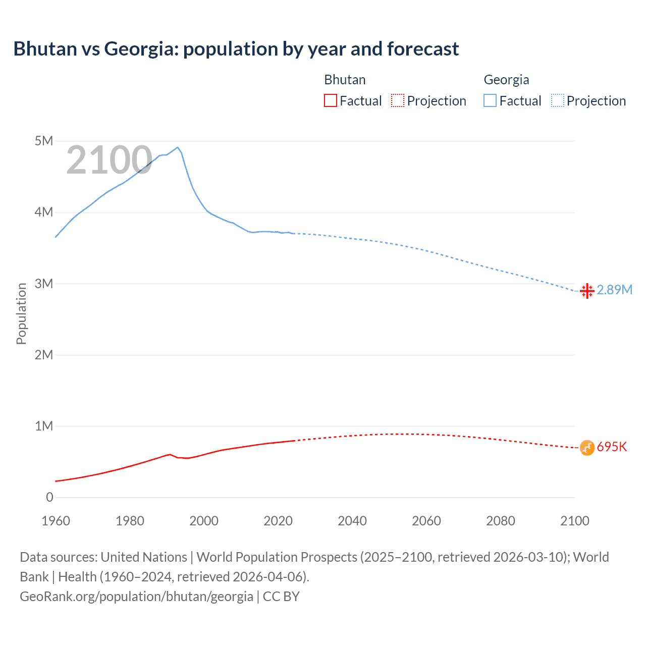 The latest officially reported population of Bhutan was 791,524 in 2024 vs 3,699,557 people in Georgia in 2024. In 2026, based on the adjusted UN estimation, the current Bhutan's population is 803,385 people compared to 3,697,615 in Georgia.