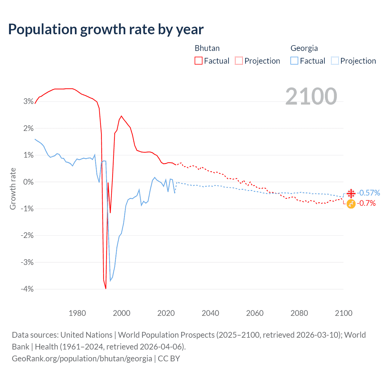 - For the last 10 years, Bhutan has had an average growth rate of +0.8% per year vs -0.04% in Georgia.