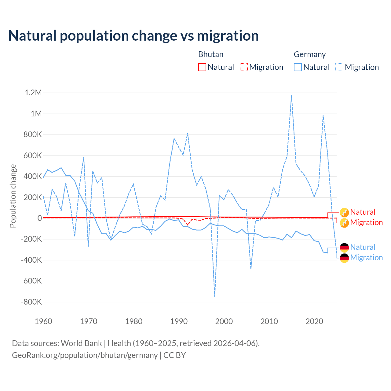 Over the last 10 years, 93.3% of the population change in Bhutan is from natural causes (a gain of 55,796 people) and 6.74% is from migration (a gain of 4,035 people). In Germany 26.8% is from natural causes (a loss of 2,036,130 people) and 73.2% is from migration (a gain of 5,565,916 people).