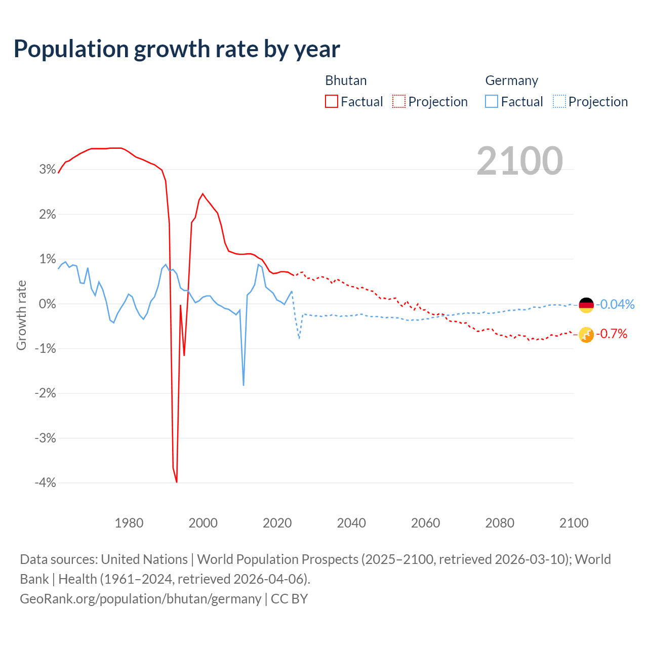- For the last 10 years, Bhutan has had an average growth rate of +0.8% per year vs +0.32% in Germany.