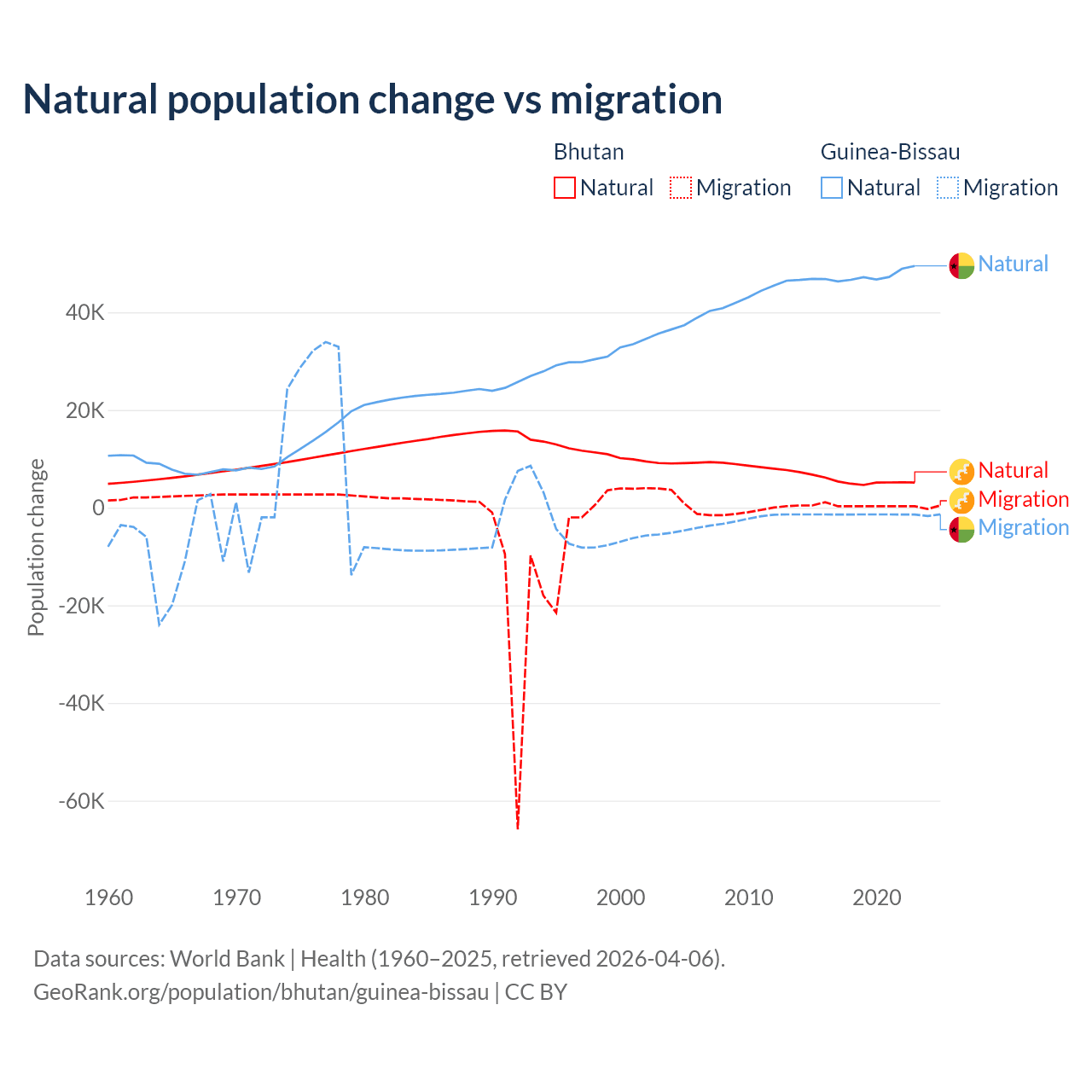 Over the last 10 years, 93.3% of the population change in Bhutan is from natural causes (a gain of 55,796 people) and 6.74% is from migration (a gain of 4,035 people). In Guinea-Bissau 97.1% is from natural causes (a gain of 472,826 people) and 2.87% is from migration (a loss of 13,956 people).